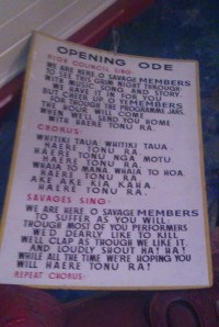 Coat of arms included poorly represented Māori warriors. The Napier Savage Club warrior was chewing on a human femur. The Ode is an interesting Monty Python-esque song with Māori verse (as seen above). The president is known as the Rangatira and is presented with the club taonga, a korowai. The clubs have haka parties who welcome guests, dressed in piupiu, poorly represented moko and holding a variety of Māori weapons. The Wanganui Savage Club is in a hall that is done as a crudely presented marae. Visiting another club is called a raid. And the members are, almost to a person, Pākehā.